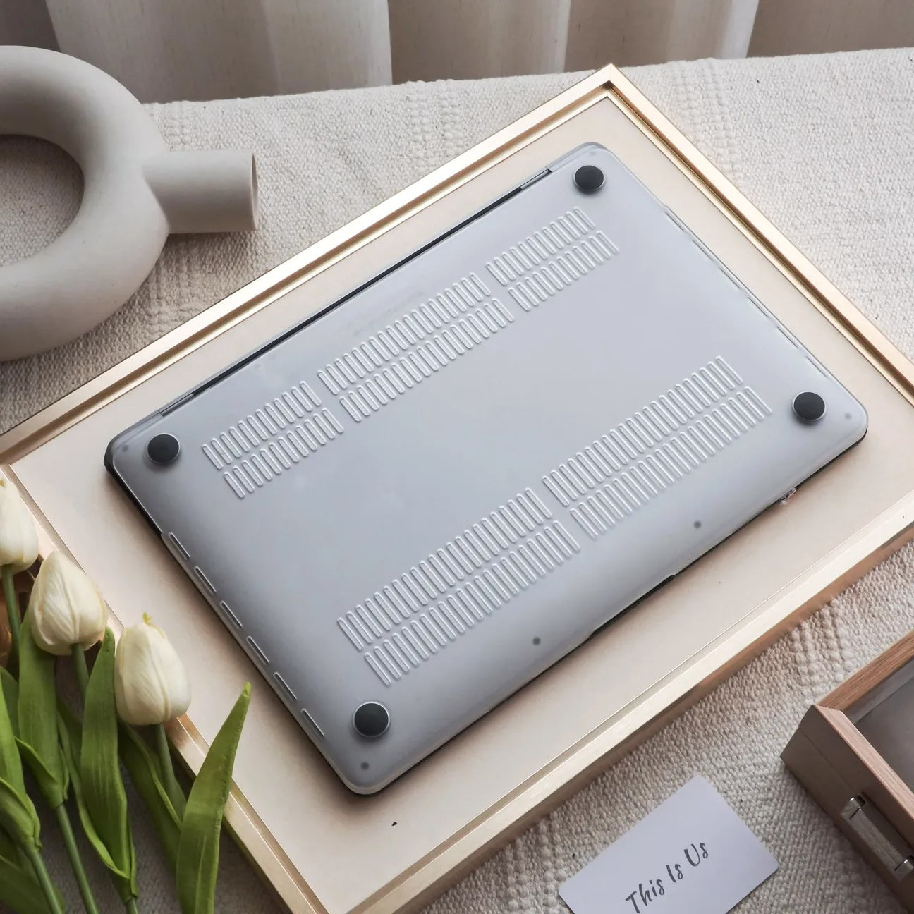>Bottom part of the case has little rubber feet so that your MacBook won’t not slip.
