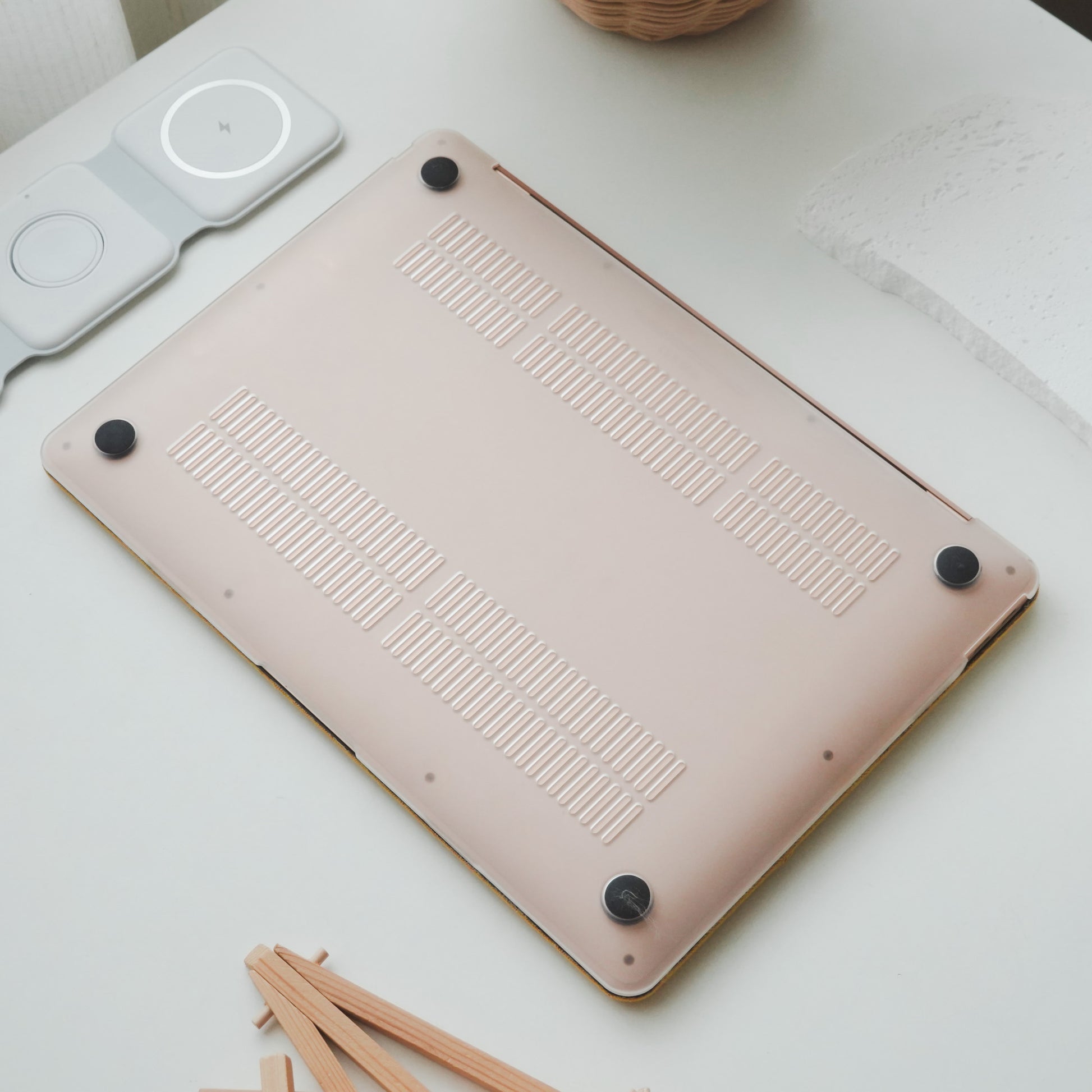 >Bottom part of the case has little rubber feet so that your MacBook won’t not slip.