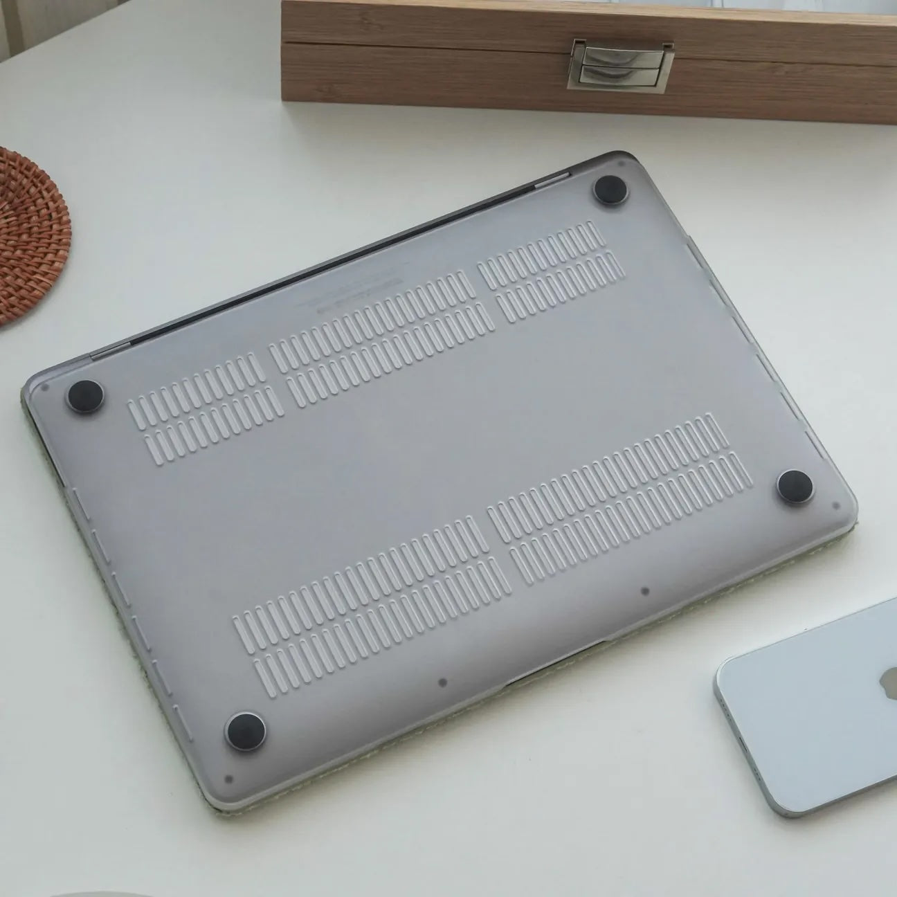 >Bottom part of the case has little rubber feet so that your MacBook won’t not slip.