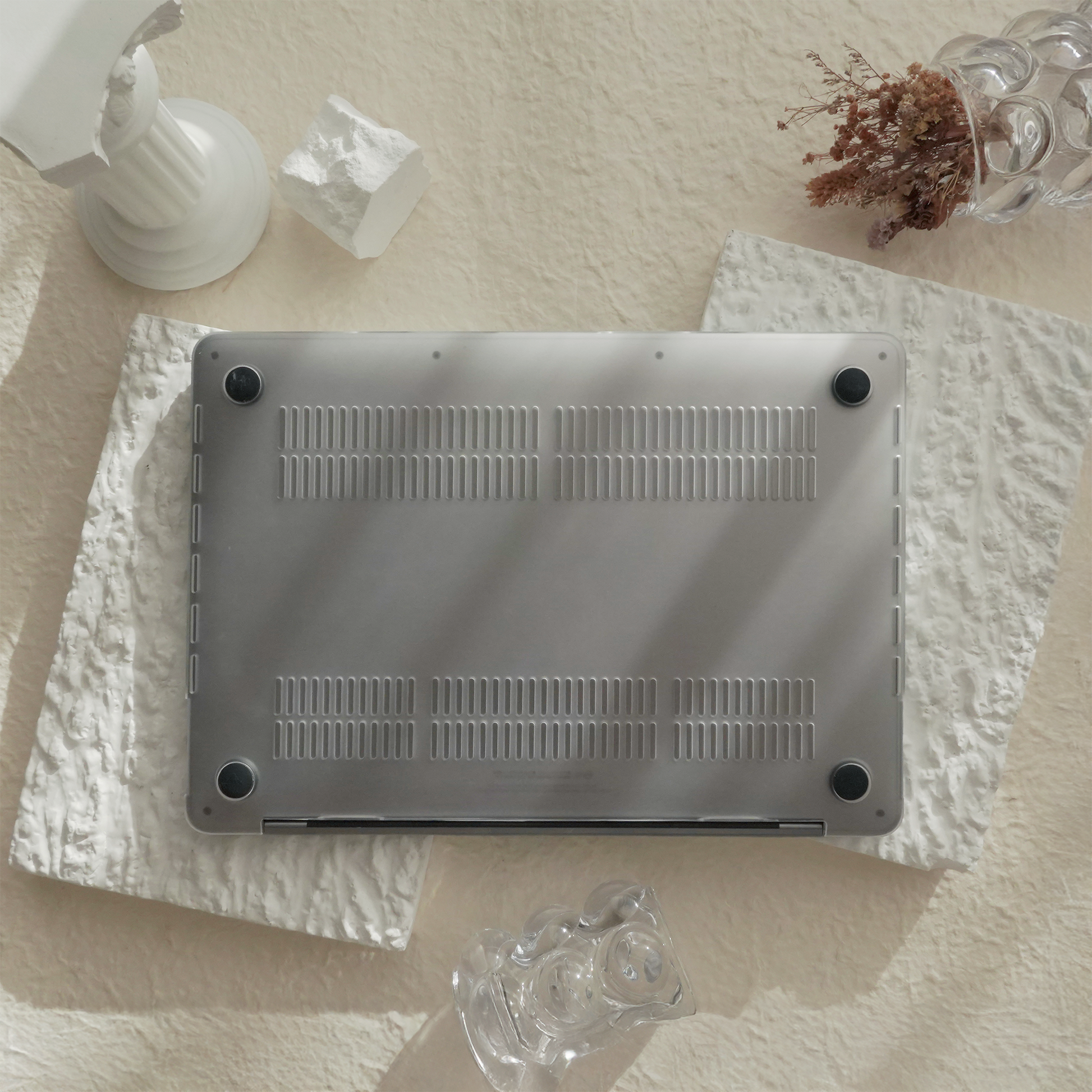 >Bottom part of the case has little rubber feet so that your MacBook won’t not slip.