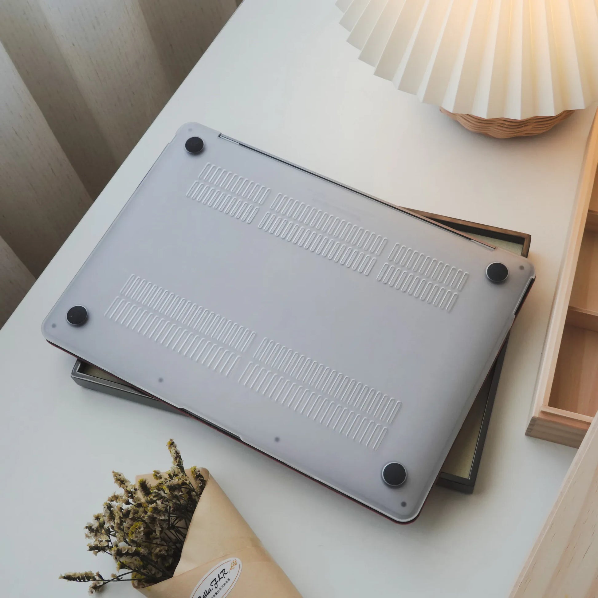 >Bottom part of the case has little rubber feet so that your MacBook won’t not slip.